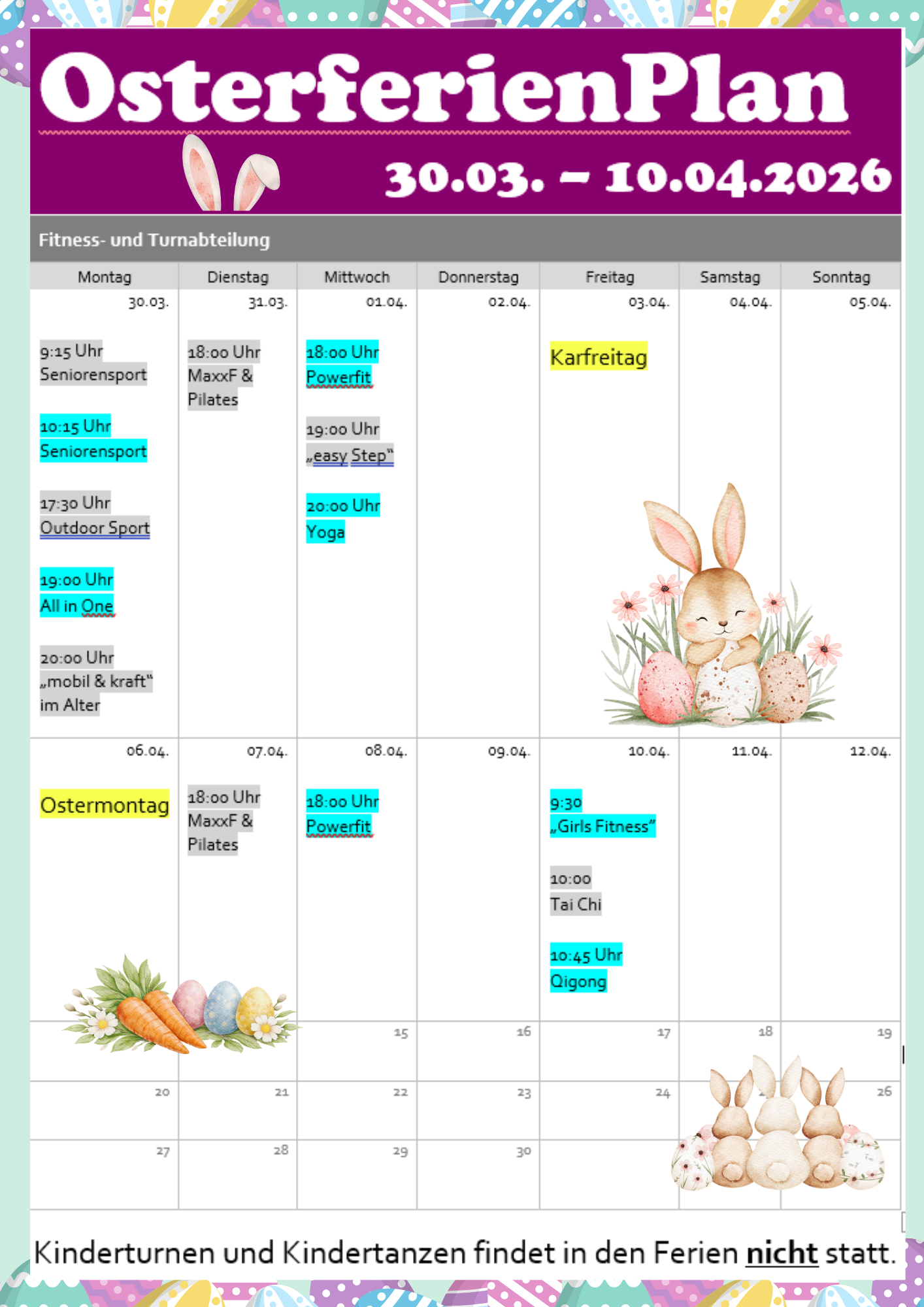 Die Fitness- und Turnabteilung bietet als größte Abteilung des TV 1877 eine Vielzahl an Fitness- und Gymnastikstunden pro Woche an. Ob jung oder älter, fit oder Einsteiger, in einem breit gefächerten Angebot ist von früh bis spät für jeden etwas dabei 🙂